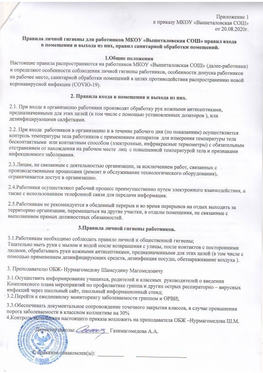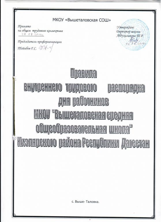 ПРАВИЛА ВНУТРЕННЕГО ТРУДОВОГО РАСПОРЯДКА ДЛЯ РАБОТНИКОВ МКОУ Вышет.СОШ.docx Документ подписан электронной подписью Серийный номер 603332450510203670830559428146817986133868575810 Директор Газимагомедова Ашура Ахмедовна Дата подписания документа 27.09.2021 18:31:28 (скачать)
