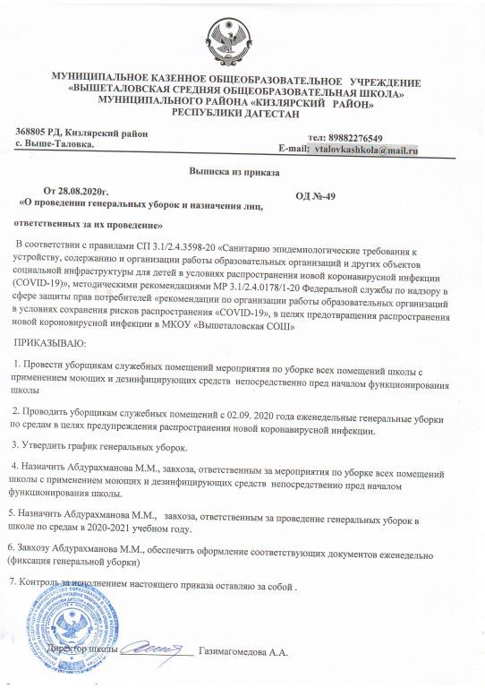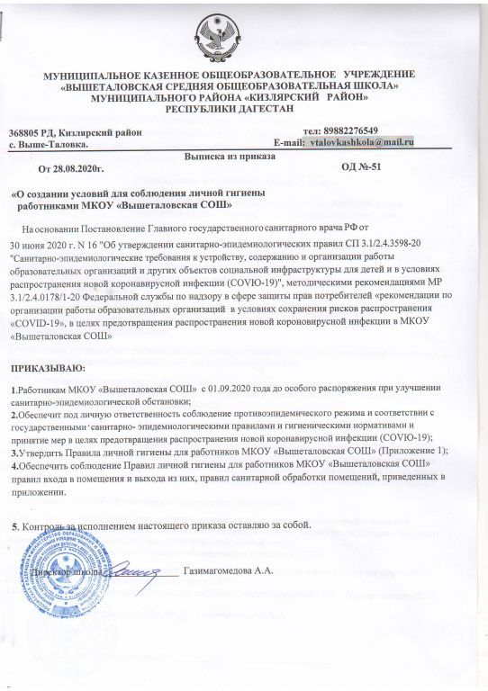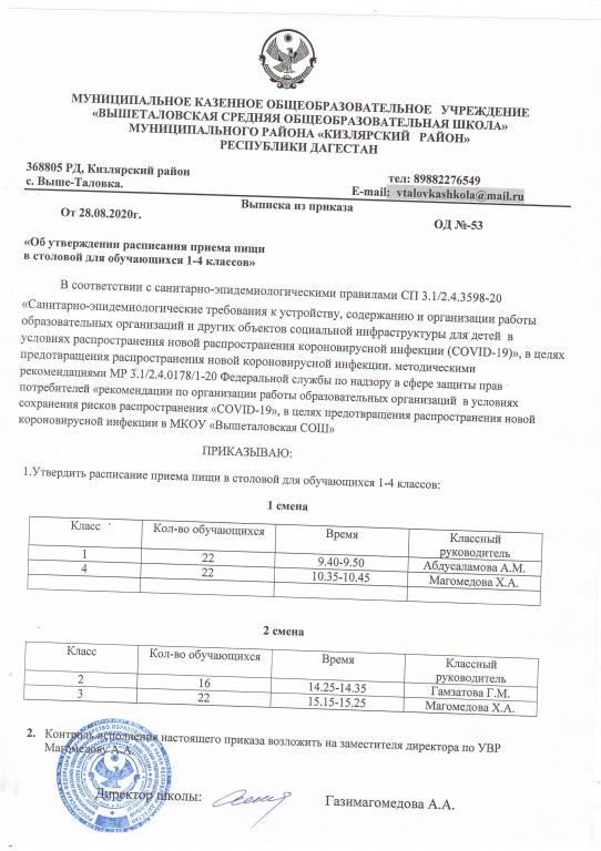 Выписка из приказа Об утверждении положения об электронной информационно-образовательной среде МКОУ Вышеталовская СОШ Документ подписан электронной подписью Серийный номер 506007919238457772130328223527430359021468957973 Директор Газимагомедова Ашура Ахмедовна Дата подписания документа 10.10.2023 18:03:06 (скачать) (посмотреть) (текст документа)